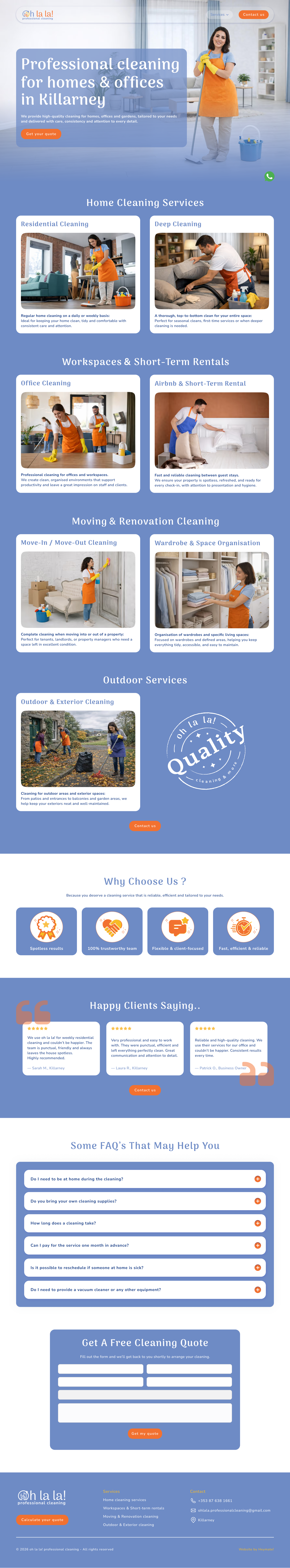 Oh la la! Professional Cleaning es una empresa de limpieza en Killarney, Irlanda, especializada en hogares, oficinas y alquileres de corta y media estancia. Acompañamos su crecimiento con un servicio integral de branding, diseño y desarrollo web, y SEO, demostrando cómo una web bien optimizada puede ayudar a las pequeñas marcas a llegar a más clientes.